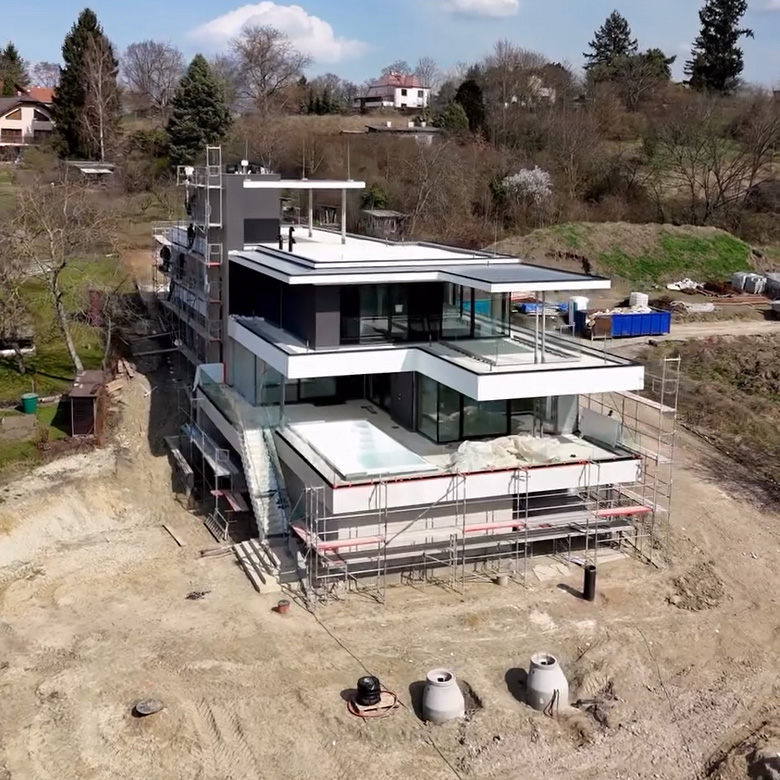 Nahlédněte s námi do vily, kde se architektura potkává s nebem. Pohled z dronu odhaluje dokonalost panoramatických oken a čisté linie strukturálních rohů, které definují celý objekt. Prostor, kde se světlo a design stávají jedním.