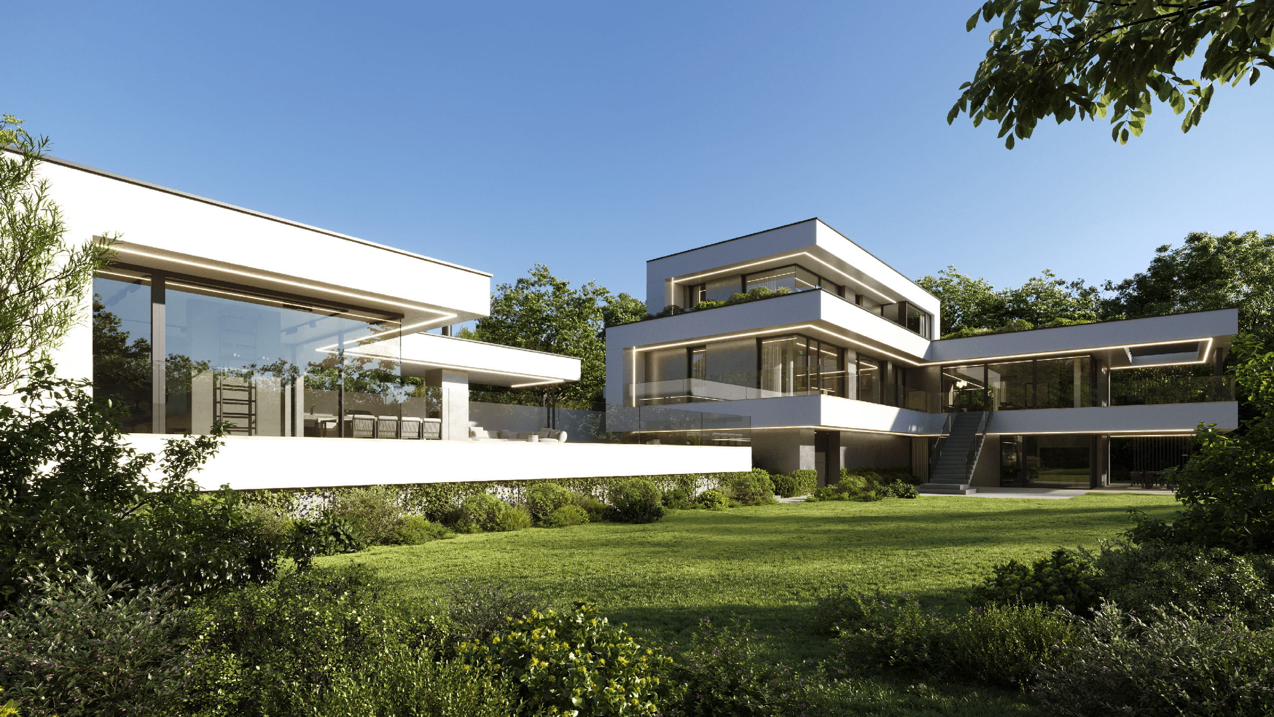 A luxurious, house with a crisp design and a view of the countryside invoking the atmosphere of Villa Tugendhat. Would you like one? Then you want to get in touch with us. Because that's exactly what do. Perfectly.